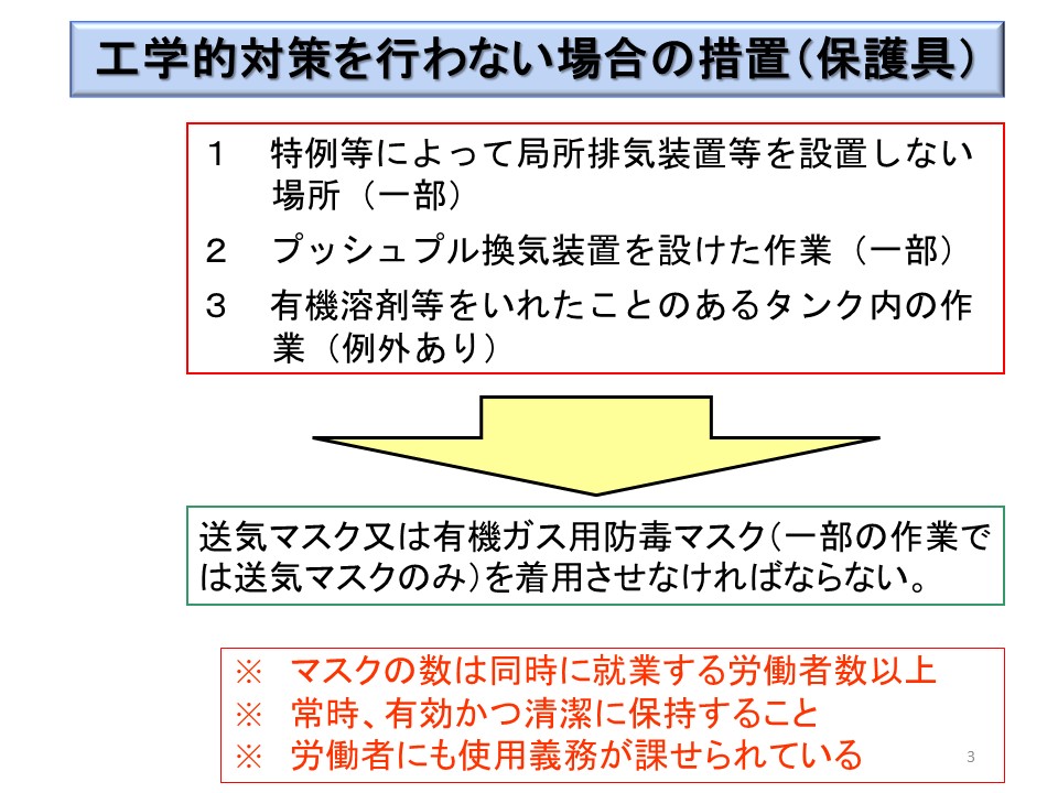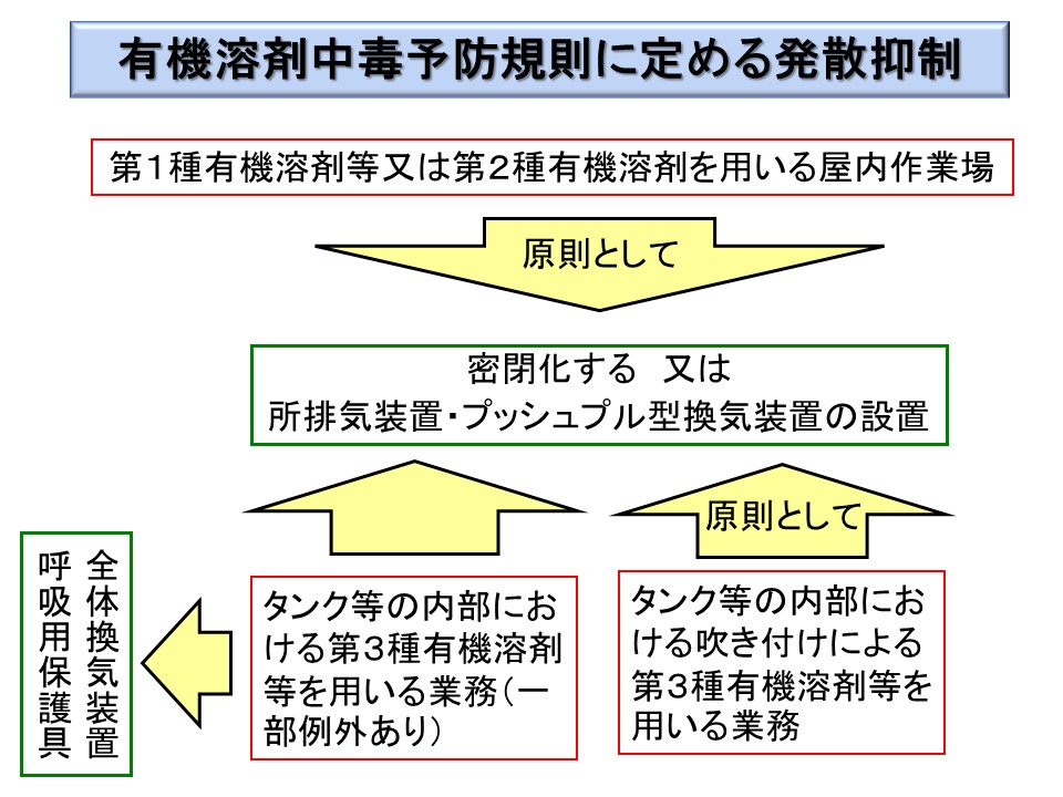 - 有機則の重要な要素は、作業環境測定や工学的対策等の作業環境管理、保護具の着用等の作業管理、健康診断等の健康管理の3管理であるが、このうち工学的対策の基本的な考え方は次のようになっている。