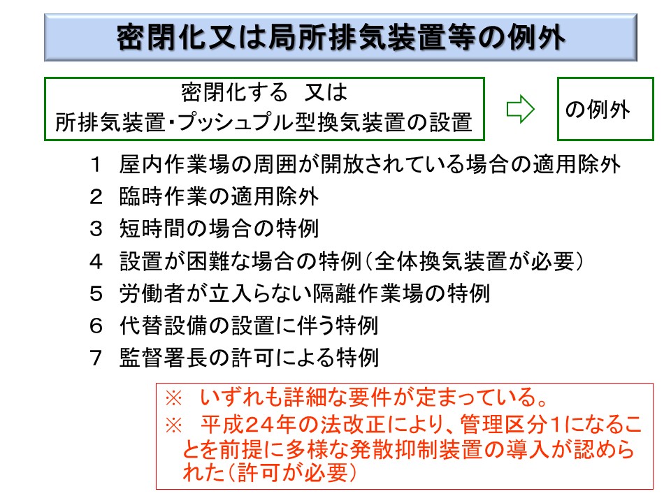 - そして、密閉化または局所排気装置等の例外は次のようになっている。