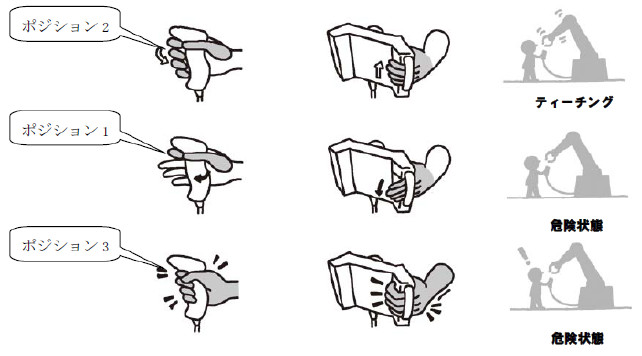 スイッチが、あらかじめ定められた動作位置に保持されている間に限り、ロボットの作動を可能にする。これは、作業者が危険な状態に驚いてスイッチを強く握りしめるか、手から取り落とすとロボットを停止させようとする装置である。