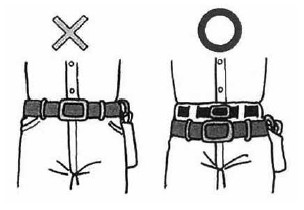 (5)正しい。胴ベルト型墜落制止用器具は、腰骨の位置に巻き付ける。腰骨より上方に装着すると墜落時に内臓や太い血管を圧迫する。また、腰骨より低い位置では、墜落時に抜け落ちるリスクがある(※)。