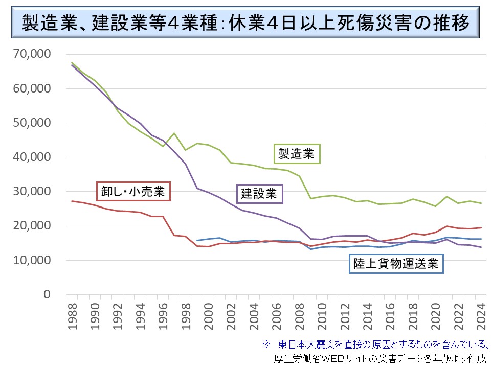 なお、厚労省の死傷病報告の災害統計分類に「陸上貨物運送業」という区分はない。これは陸災防関連の災害発生件数を表すときに用いられる区分で、厚労省によると「道路貨物運送事業と陸上貨物取扱業の合計値」であるとされている。