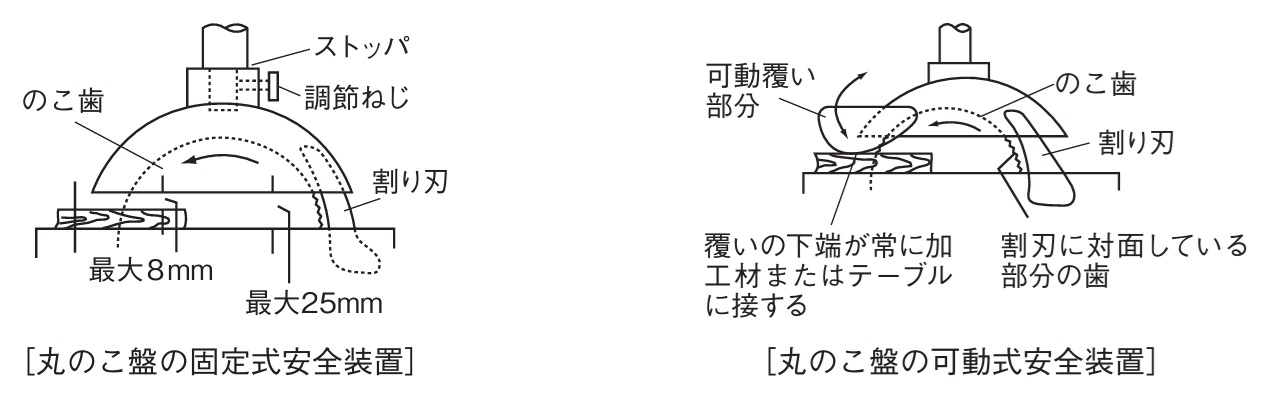 ※ 割刃とは、丸のこの刃を覆うカバーのような形状をしており、切断される材料を押さえるような作用をする。実務においては、「刃先が見えない」「材料を切断するときに、材料が動かしにくい」などの理由で、外されていることがあるので注意する必要がある。