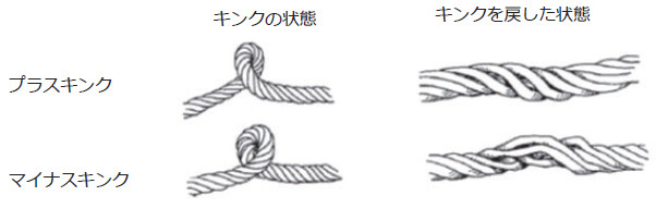 (3)ワイヤロープのキンクには、局部的によりが詰まったもの(プラスキンク)と局部的によりが戻ったもの(マイナスキンク)がある。