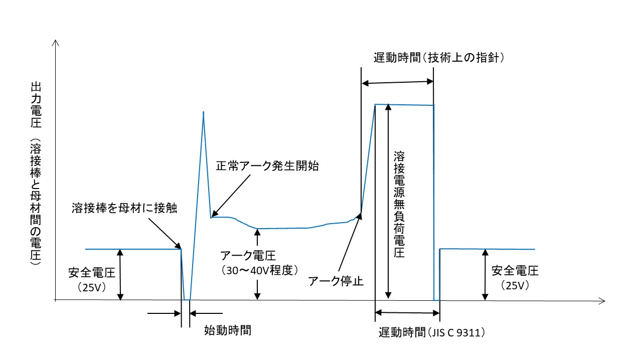 (4)適切ではない。溶接棒と非溶接物(母材)の間の電圧をゼロにすると、溶接作業を再開することができない。そのため交流アーク溶接機用自動電撃防止装置では、アークを出していないときは安全電圧(構造規格では30ボルト以下、JISでは25ボルト以下と定められ、実際には20ボルト程度のものが多い)まで低下させる。