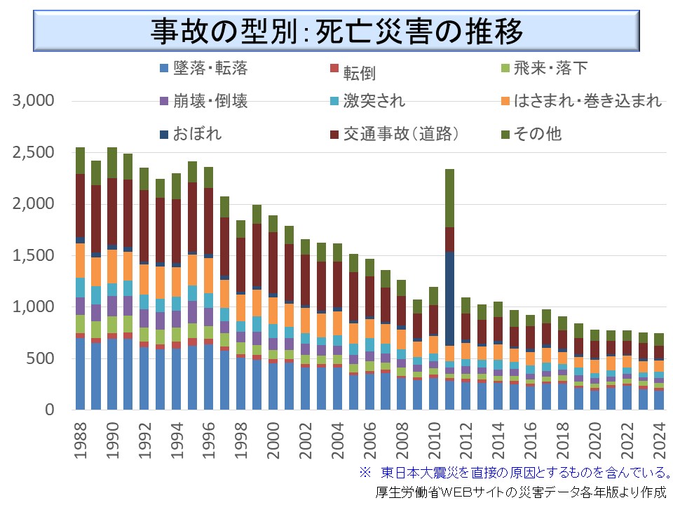 (3)全産業における死亡者数を事故の型別にみると、墜落・転落が最も多くなっている。