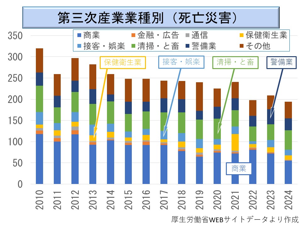 (5)正しい。第三次産業における死亡者数は、商業74人、保健衛生業11人、接客娯楽業13人で、この三つの業種について死亡者数を比較すると、商業が最も多くなっている。