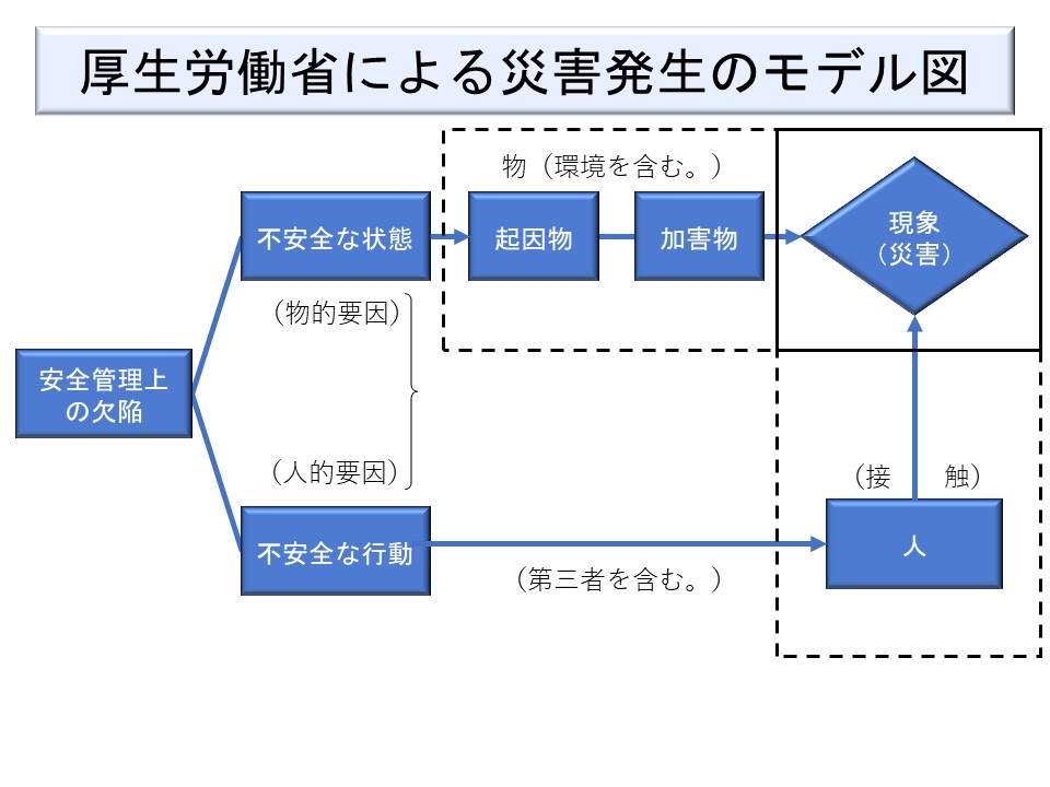 図は、厚労省が労働災害の発生について説明するときに使用する図を簡略化したものである。愛媛労働局の資料(労働災害を防止するために)に「労働災害は、「不安全な状態」(物的要因)と「不安全な行動」(人的要因)が接触した現象と説明されます