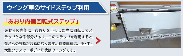 ロ ウイング車のあおりの内側に、あおりを下ろした際にステップとして利用できる部材を取り付ける。