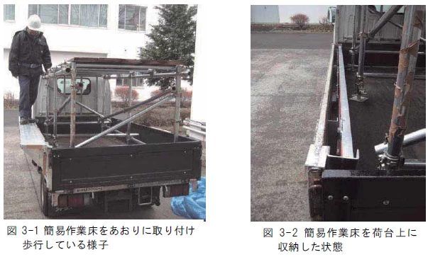 これは、ハの設備とは異なり、手すりがあるため墜落・転落防止の設備としてはより有効ではあるが、設備のある場所でなければ使用できず、また、設置するのに2人以上の作業者が必要になるという課題がある。