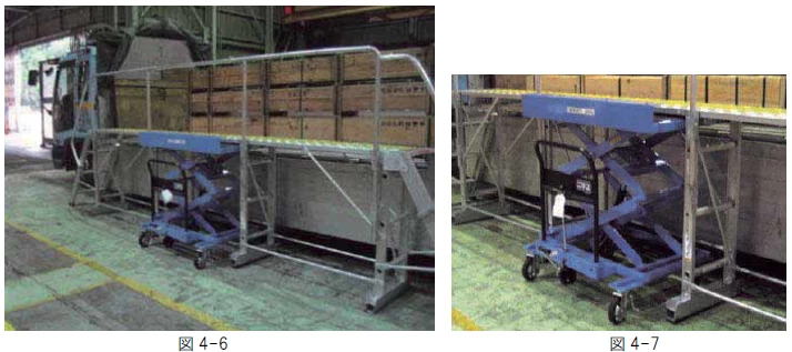 ニ 荷役作業場所にキャスター付きの移動式プラットホームを用意し、プラットホームの高さを調整して使用する。