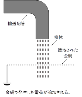 (1)絶縁性粉体を輸送する配管の先端近くに、接地した金網を粉体の吹き出し方向と垂直に取り付けると、絶縁性粉体の静電気帯電を除去する方法として有効である。