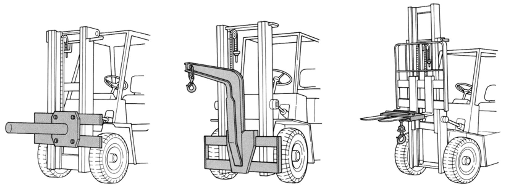 なお、フォークリフトメーカーは、様ざまなフォークリフト用のアタッチメントを販売しており、その中には、フォークリフトで荷をつり上げるためのものも存在している。厚労省はこれらの使用も用途外使用に当たるとしており、メーカーの純正品を使用するのであれば、安衛則第 151 条の 14 の但書によって法違反には当たらないとする(※)。