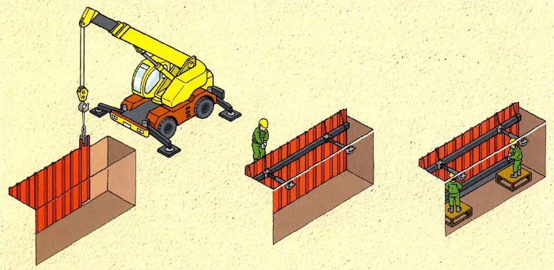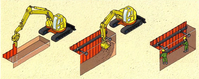 掘削した地山が自立することを前提とした工法であり、その手順は、一定の深さまで掘削機械により溝掘削を行い、軽量鋼矢板を建て込んだ後、所定の深さまで押し込み、地上から専用の治具を使用して最上段の腹おこし及び切りばりを設置して土止め支保工を組み立てる方式である。2段目以降の腹おこし及び切りばりの設置は、専用の作業台を使用して行う。