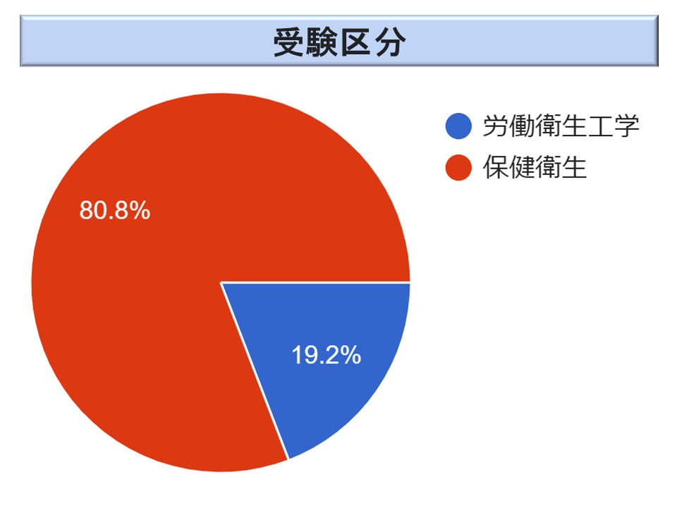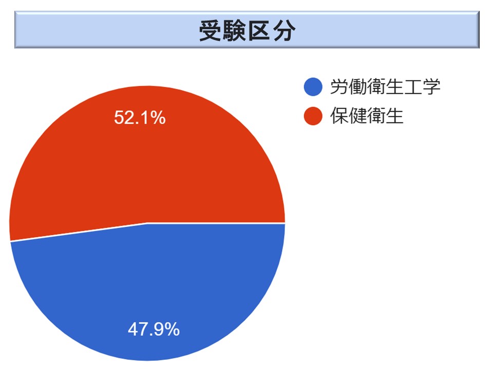 試験区分は、保健衛生が52.1%(58.8%)、労働衛生工学が47.9%(41.2%)であった。労働衛生法令より労働衛生工学の比率が高いのは、労働衛生工学を受ける受験者はその保有資格によって労働衛生一般の免除を受けることができる方が少ないからである。