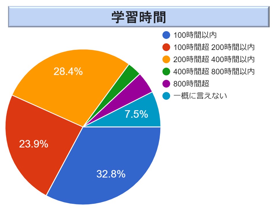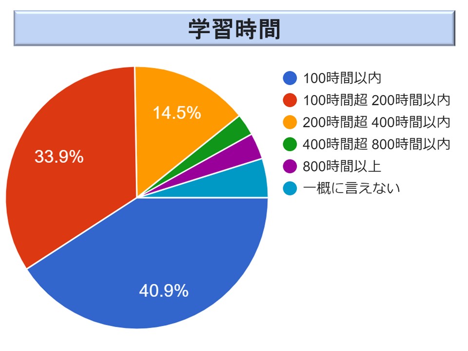 ただ、200時間超の方が20.4%(21.3%)おられ、800時間を超えると回答した方も3.2%(1.4%)おられる。やはり、多くの学習時間を費やす必要のある試験ということでもあろう。