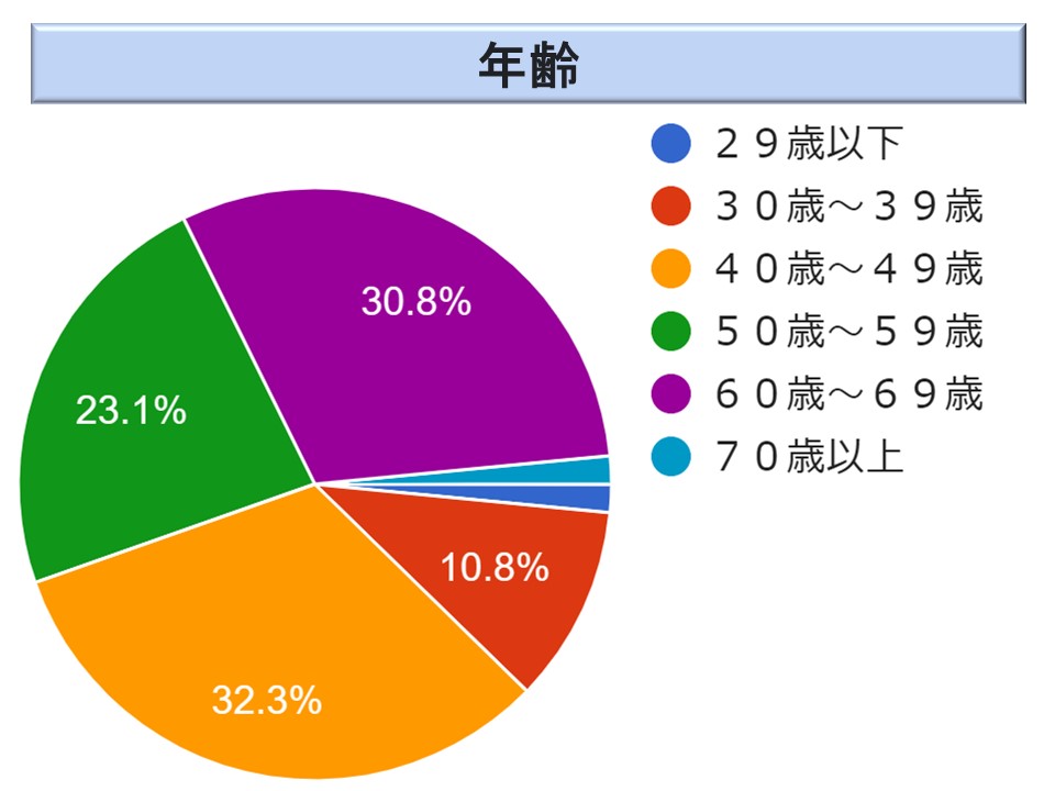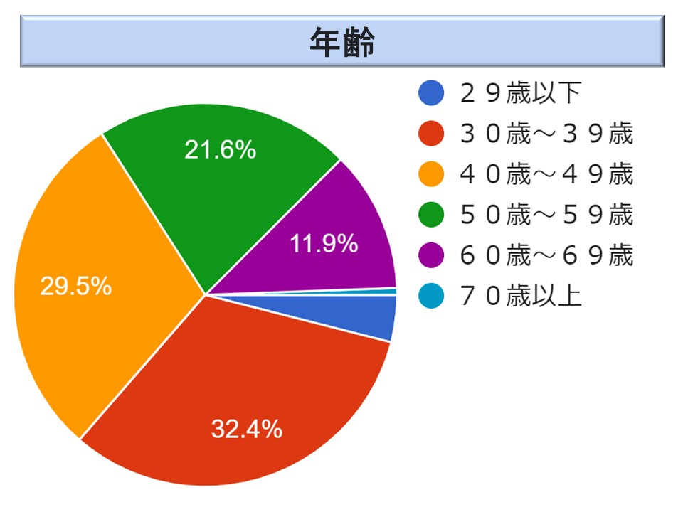 年齢は176名の方に御回答を頂いている。やはり試験の性格からか20代の方は4.0%(3.0%)と少なかった。30代が32.4%(28.0%)、40代が29.5%(24.2%)と働き盛りの方が多いようだ。