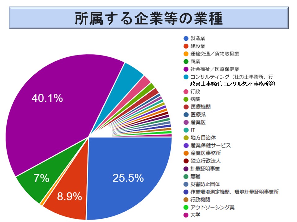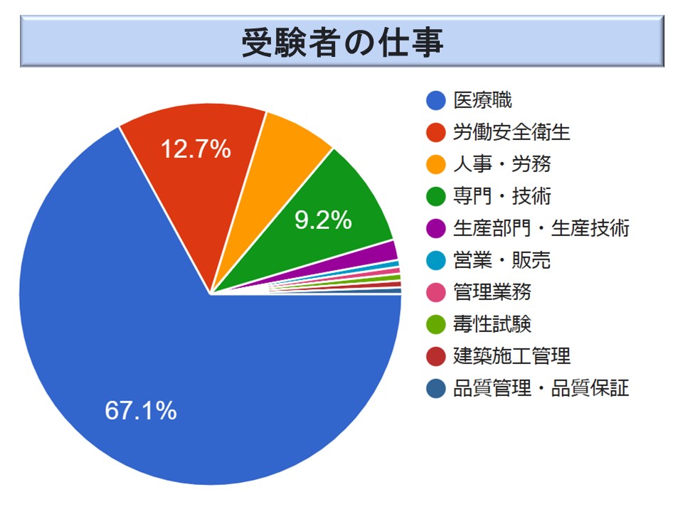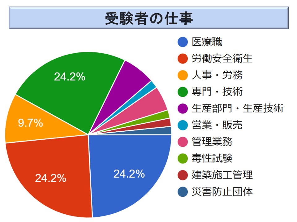 受験者は、職場の安全衛生の担当者のみならず、医師、技術士など他の分野の専門家も数多く受験しています。