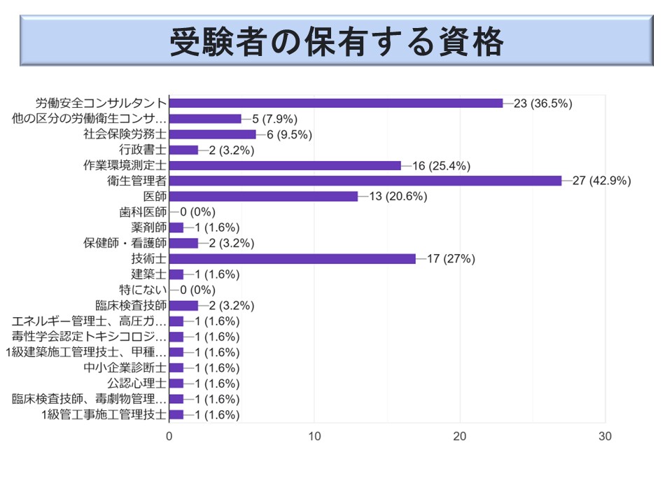 安全コンサルタントの合格者の方も22名(12名)、作業環境測定士が 16 名(9名)おられ、これらの受験者は労働安全衛生の専門家の方と思われる。