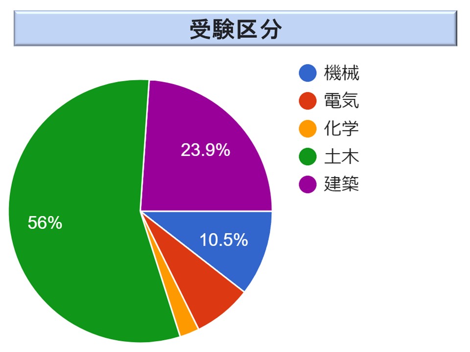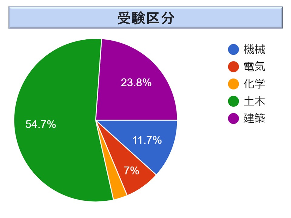試験区分は、ほぼ昨年と同様な傾向であるが、土木が 54.7 %(2022年度 60.1%以下カッコ内 2022 年度)と過半を占め、建築が 23.8 %(16.0%)、機械が 11.7 %(12.3 %)、化学 2.8 %(6.6 %)、電気 7.0 %(4.9 %)であった。化学が激減しているが、昨年急増したのでその反動だろうか。