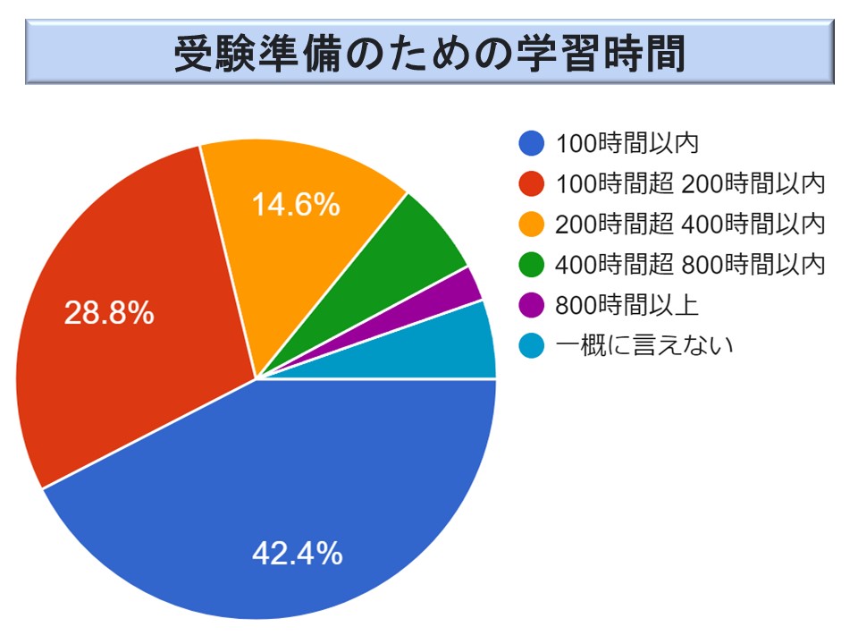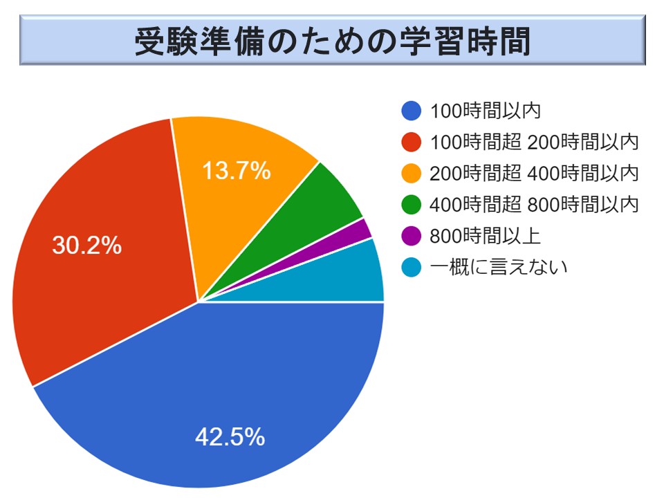 ただ、200 時間超の方が全体で 21.7 %(24.2 %)おられ、800 時間を超えると回答した方も 1.9 %(0.4 %)おられる。やはり、多くの学習時間を費やす必要のある試験ということでもあろう。ただ、2023 年度は2022 年度より学習時間がわずかではあるが短くなっているようだ。