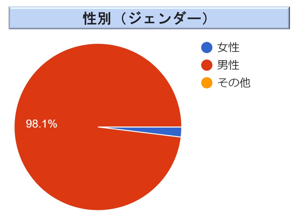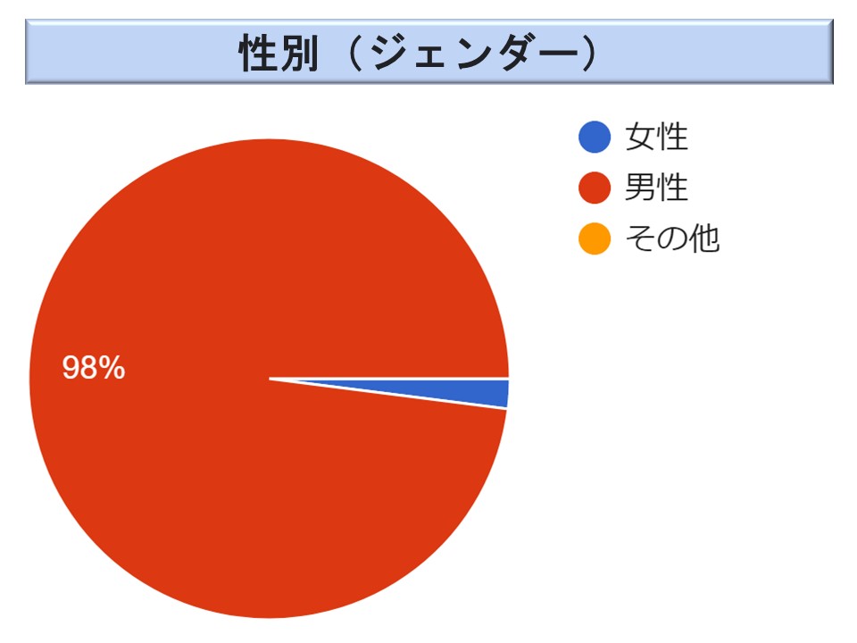ジェンダー(性別)は199名の方に御回答を頂いている。女性が2%と産業安全法令とほぼ同様である。。