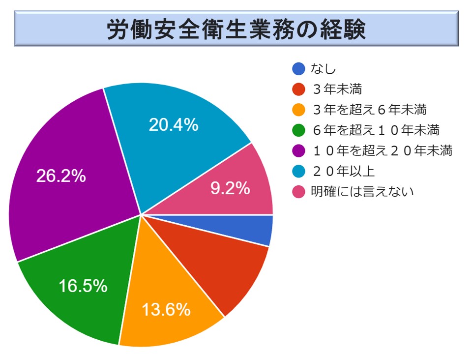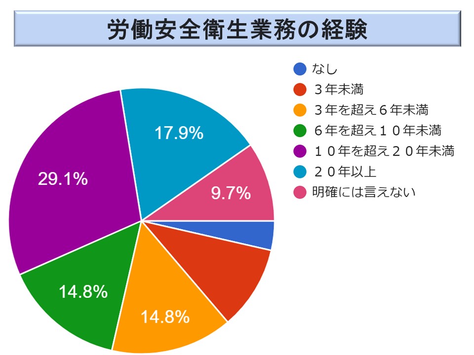 労働安全業務の経験は 196 名の方に御回答を頂いている。産業安全法令と大きくは変わらないが、やや経験年数の長い方が多くなっているような印象を受ける。