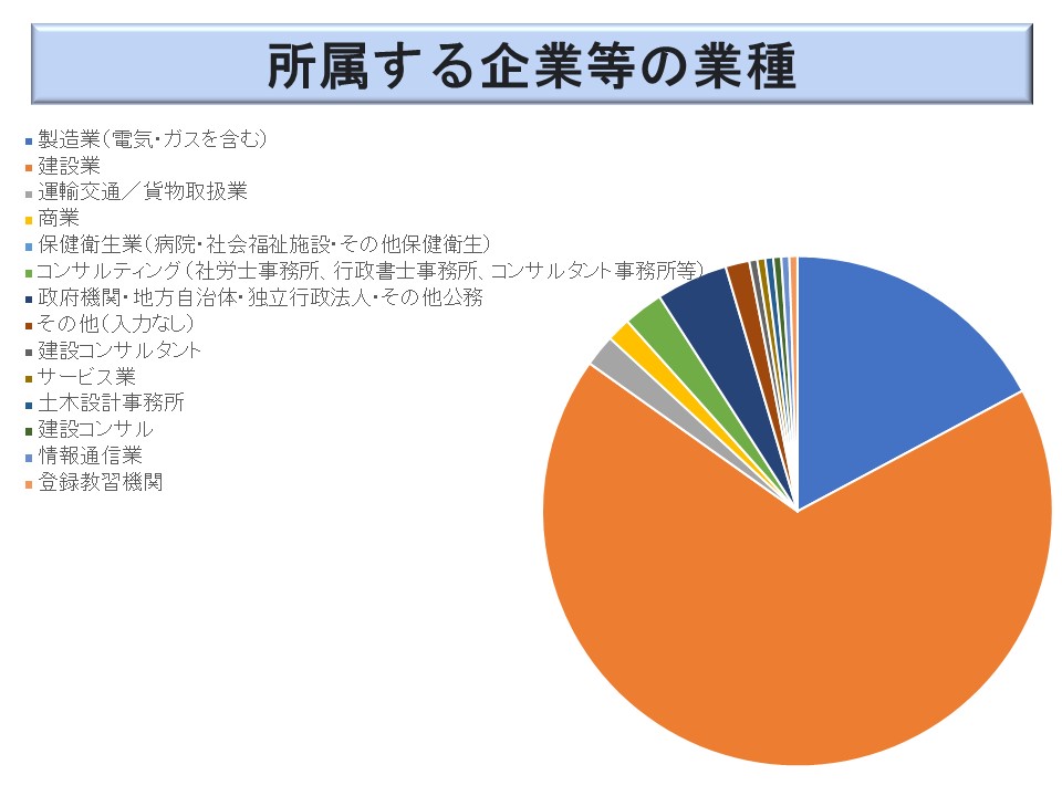 建設業が最も多く 67.1 %(67.0 %)を占めた。次いで多いのが製造業の 17.4 %(17.2 %)で、この2つで 84.5 %(84.1 %)と8割を超える。「労働安全」という職能がこの2つの業種に限られているということであろうか。その他は、「政府機関・地方自治体・道立行政法人・その他の公務」の4.3%が目立つ程度で、「コンサルティング(社会保険労務士等)」、「運輸交通/貨物取扱」「商業」がそれぞれ 1.9%など、他の業種が意外なほどに少なかった。
