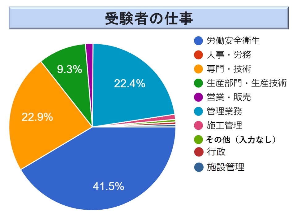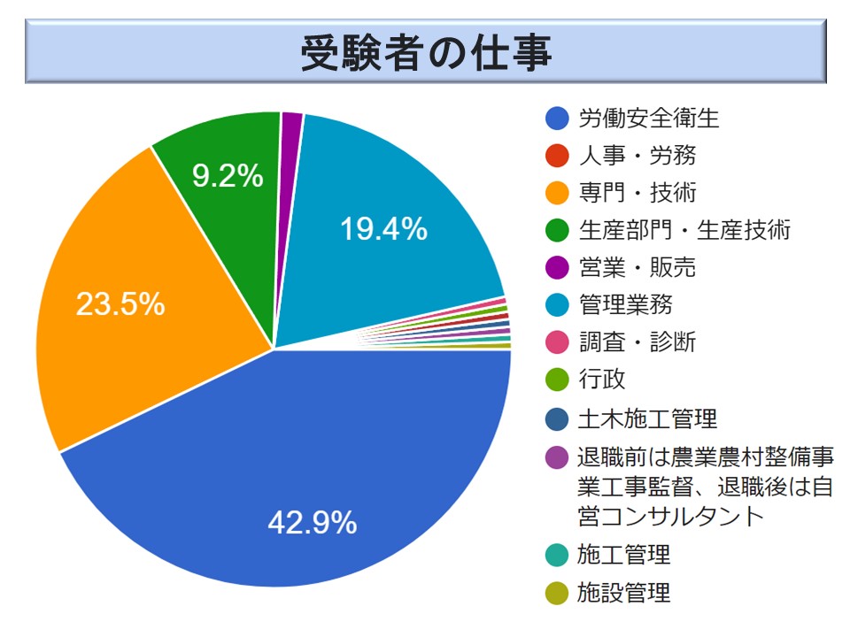 受験者は、職場の安全衛生の担当者のみならず、医師、技術士など他の分野の専門家も数多く受験しています。