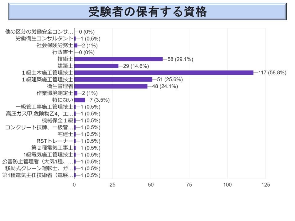 この受験者に関するこのアンケート調査は今年度で3年目になる。その結果からは、受験者の年齢の高さと経験年数の長さから、労働安全という職能分野のグループは、短期間では育成が困難な専門家の集団だということが分かる。