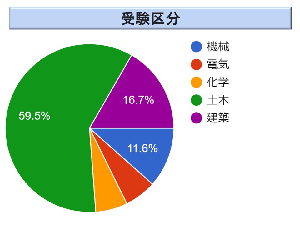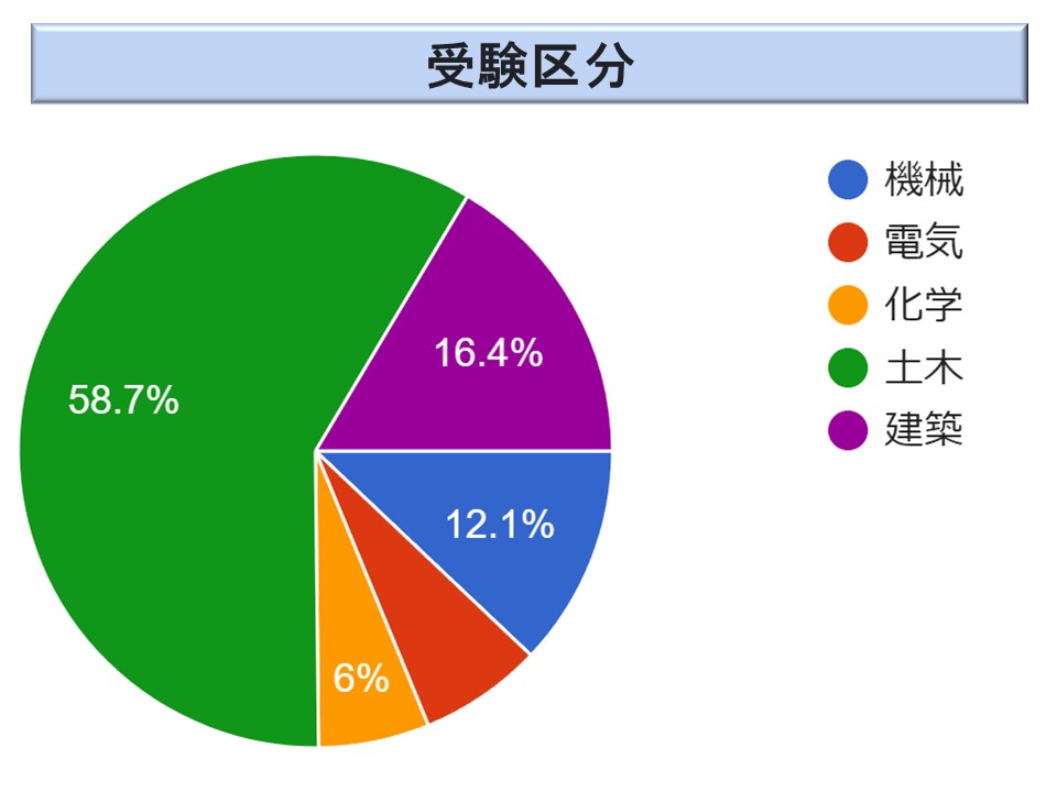 試験区分は、ほぼ昨年と同様な傾向であるが、土木が 58.7 %(2023年度 54.7%以下カッコ内は 2023 年度の値)と過半を占め、建築が 16.4 %(23.8 %)、機械が 12.1 %(11.7 %)、化学 6.0 %(2.8 %)、電気 6.7 %(7.0 %)であった。建築が急減し、化学が急増しているが、いずれも昨年の反動だろう。