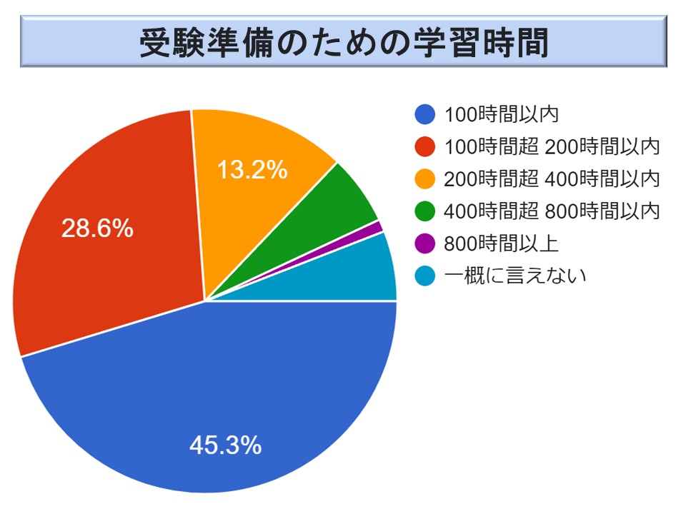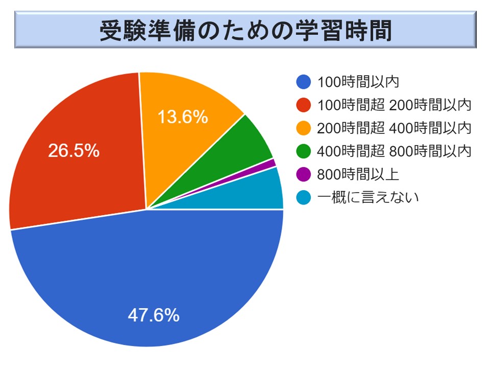 ただ、200 時間超の方が全体で 20.7 %(21.7 %)おられ、800 時間を超えると回答した方も 1.0 %(1.9 %)おられる。やはり、多くの学習時間を費やす必要のある試験ということでもあろう。ただ、2023 年度は2022 年度より学習時間がわずかではあるが短くなっているようだ。