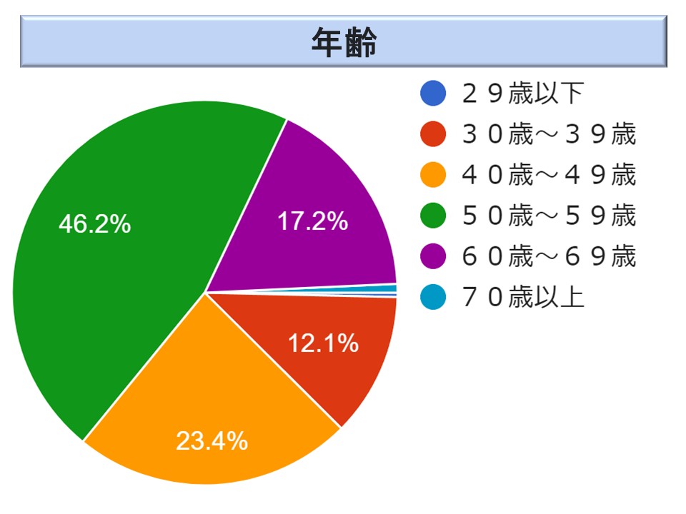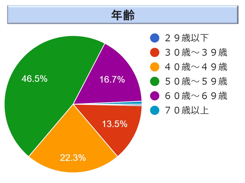 意外なことに 50 歳代の方が 46.5 %(43.0 %)とかなりの割合を占めている。リスキリングによる退職準備という意味合いもあるのだろうか。