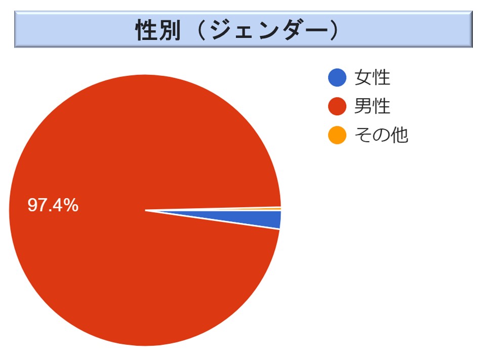 ジェンダー(性別)は269名の方に御回答を頂いている。女性が 2.2 %、その他の方が 0.4 %と産業安全法令とほぼ同様である。