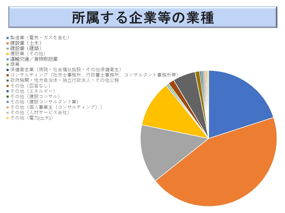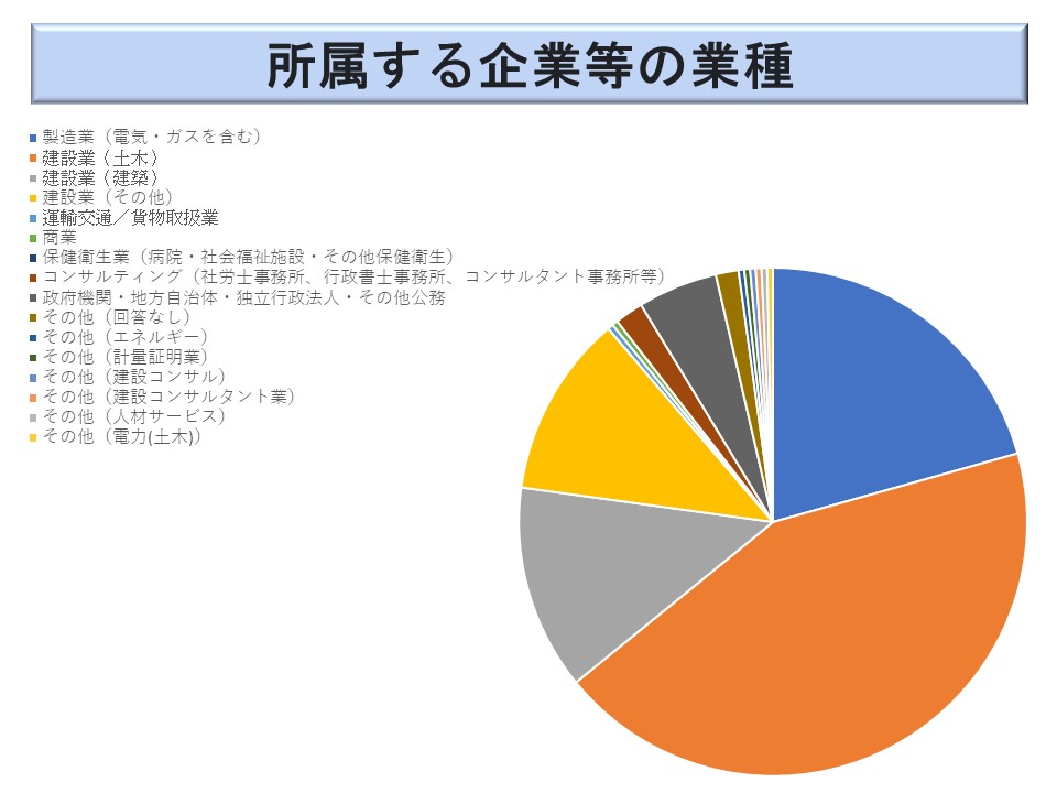 建設業が最も多く 44.1 %を占めた(※)。次いで多いのが製造業の 19.9 %(17.4 %)で、この2つで 89.3 %(84.5 %)と9割近くとなっている。「労働安全」という職能がこの2つの業種に限られているということであろうか。その他は、「政府機関・地方自治体・道立行政法人・その他の公務」の 5.3 %(4.3%)が目立つ程度で、「コンサルティング(社会保険労務士等)」が 1.4 %(1.9 %)、「運輸交通/貨物取扱」が 0.4 %(1.9 %)、「商業」が 0.4 %(1.9 %)など、他の業種は極めて少ない実態にある。