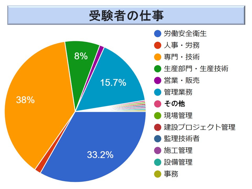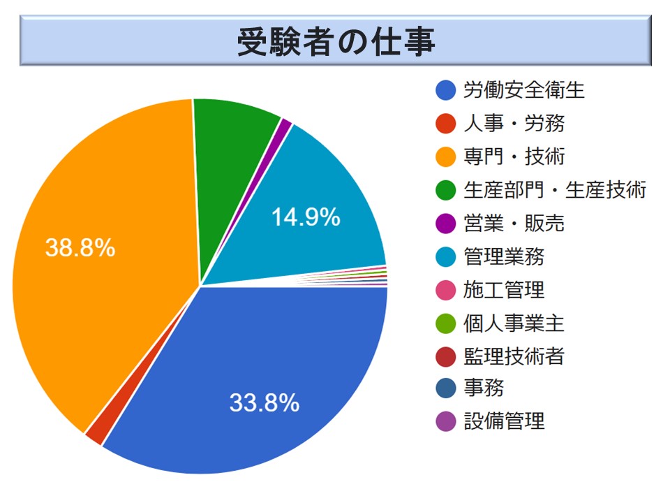 受験者は、職場の安全衛生の担当者のみならず、医師、技術士など他の分野の専門家も数多く受験しています。
