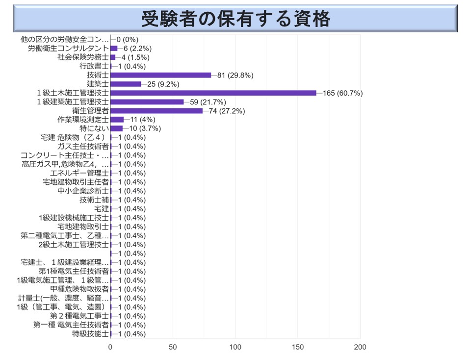 受験者の保有する資格は、272 名の方から御回答を頂いた。「宅建・危険物(乙4)」以下が「その他」の項目の自由回答である。