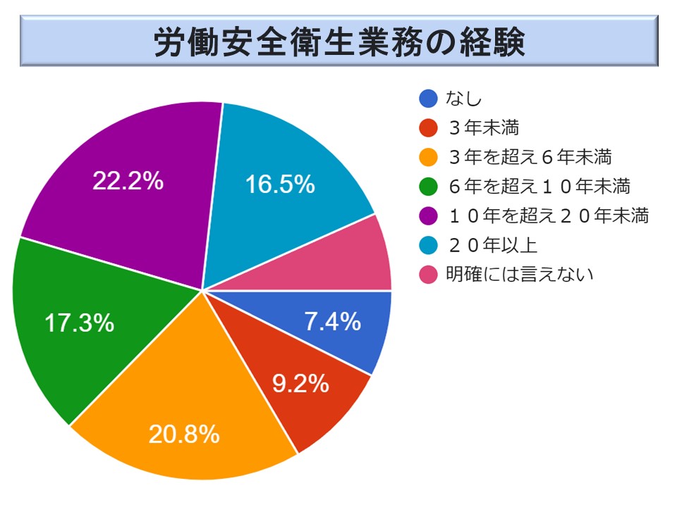 労働安全業務の経験は 284 名の方に御回答を頂いている。回答は、「なし」から「20年以上」まで、ばらついている。20 年以上が 16.5 %(20.4 %)と、長期の実務経験者が多いということが分かる。
