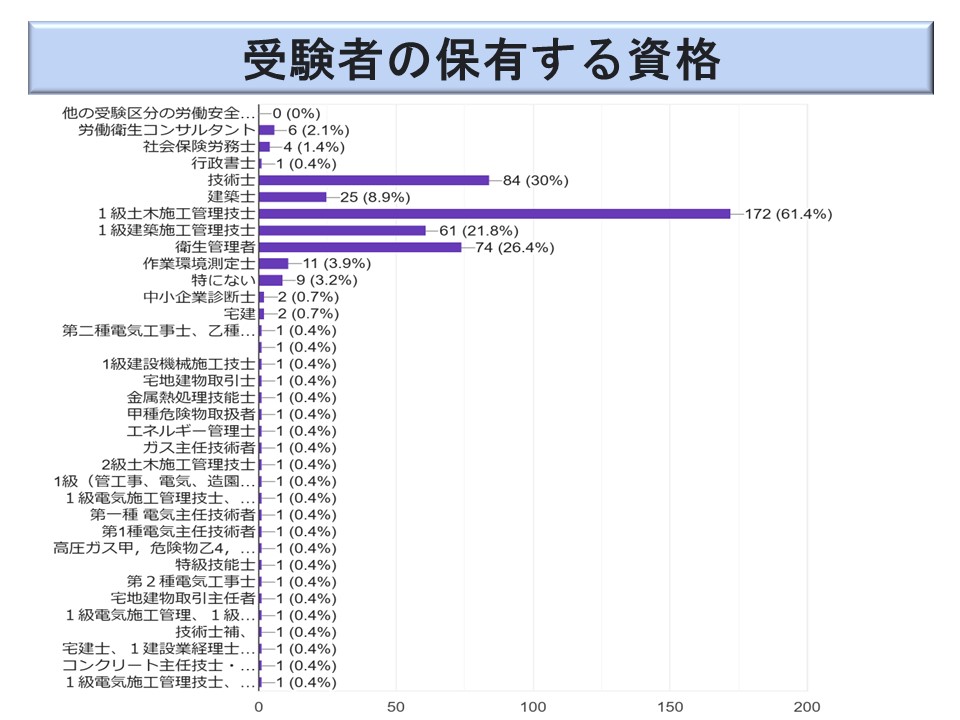 この受験者に関するこのアンケート調査は今年度で4年目になる。その結果からは、受験者の年齢の高さと経験年数の長さから、労働安全という職能分野のグループは、短期間では育成が困難な専門家の集団だということが分かる。