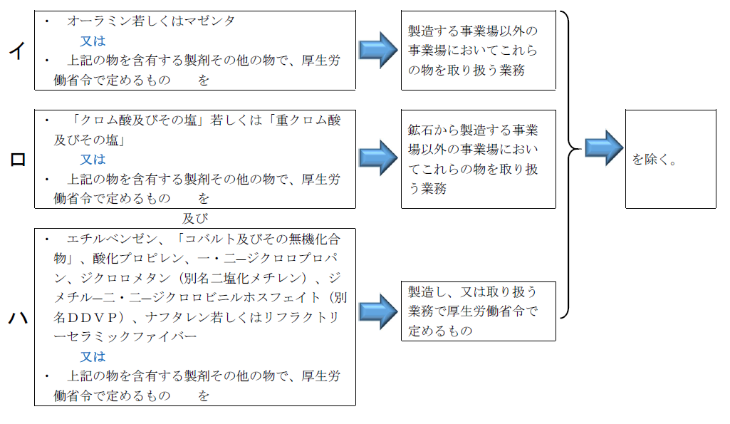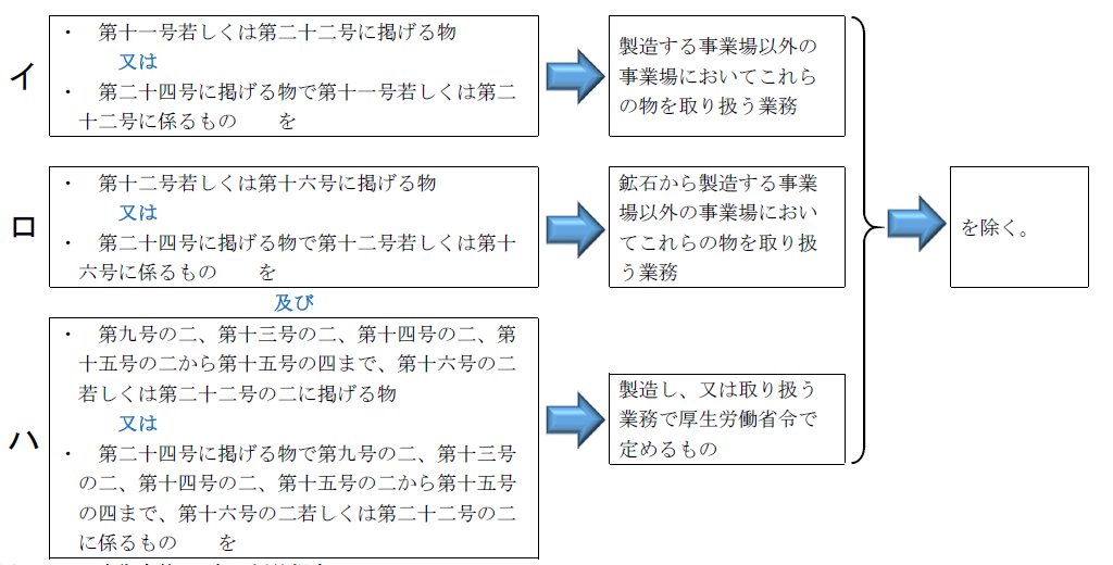 第十一号若しくは第二十二号に掲げる物又は第二十四号に掲げる物で第十一号若しくは第二十二号に係るものを製造する事業場以外の事業場においてこれらの物を取り扱う業務、第十二号若しくは第十六号に掲げる物又は第二十四号に掲げる物で第十二号若しくは第十六号に係るものを鉱石から製造する事業場以外の事業場においてこれらの物を取り扱う業務及び第九号の二、第十三号の二、第十四号の二、第十五号の二から第十五号の四まで、第十六号の二若しくは第二十二号の二に掲げる物又は第二十四号に掲げる物で第九号の二、第十三号の二、第十四号の二、第十五号の二から第十五号の四まで、第十六号の二若しくは第二十二号の二に係るものを製造し、又は取り扱う業務で厚生労働省令で定めるものを除く。