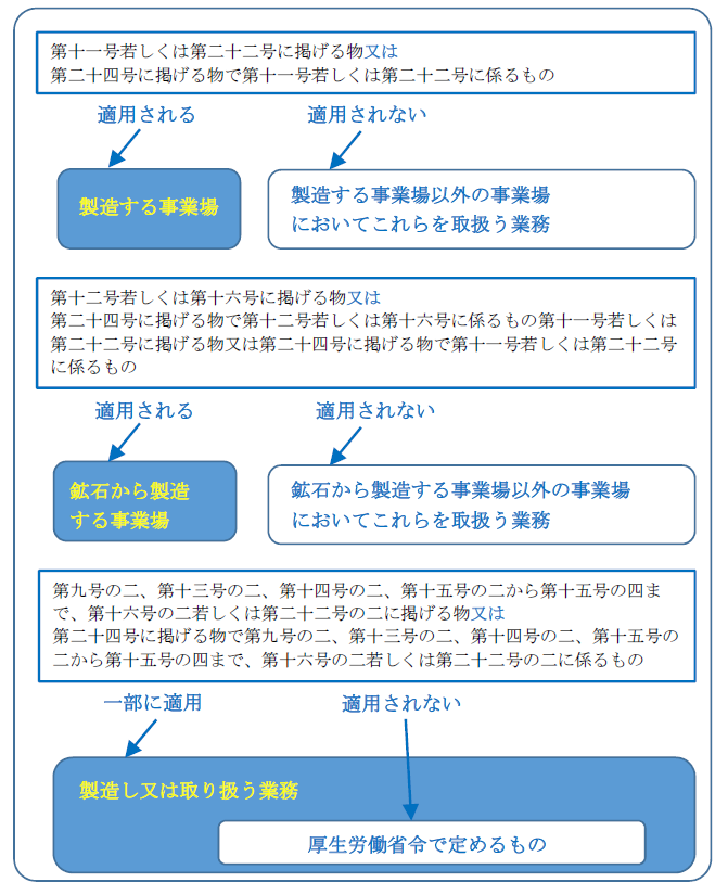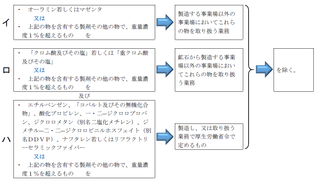 また、「クロム酸及びその塩」若しくは「重クロム酸及びその塩」及びこれらを含有する製剤その他の物については、鉱石から製造する事業場についてのみ適用があることが分かる。