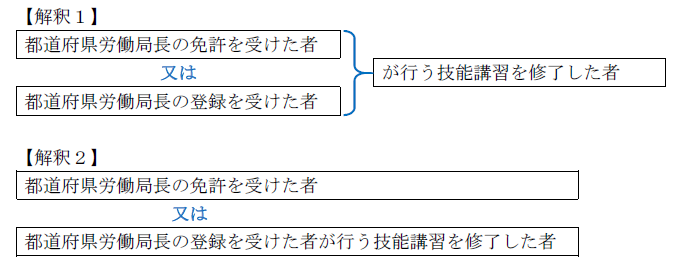 もちろん、都道府県労働局長の免許を受けた者は技能講習を実施してはいないので、解釈2の方が正しいのである。仮に解釈1の意味だとすると、条文は次のようになっていなければならないのである。