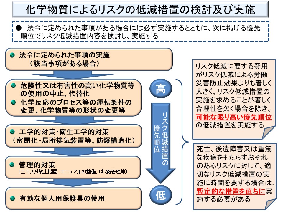 なお、旧指針では、「危険性又は有害性の高い化学物質等の使用の中止、代替化」が「化学反応のプロセス等の運転条件の変更、化学物質等の形状の変更等」よりも優先順位が高かったのである。これがRA指針では、同じ優先順位に変更されている。