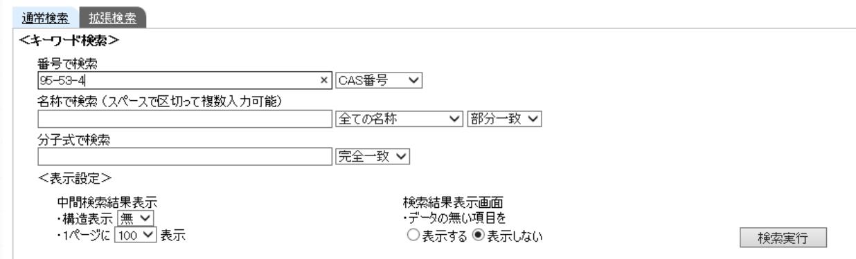 そこで、次に、独立行政法人製品評価技術基盤機構(NITE)の化学物質総合情報提供システム(CHRIP)で検索してみる。検索画面は次図のようになっている。弁号で検索にCAS RN®を入力して(図ではo-トルイジンのCAS RN®を入力してある)検索実行のボタンをクリックする。