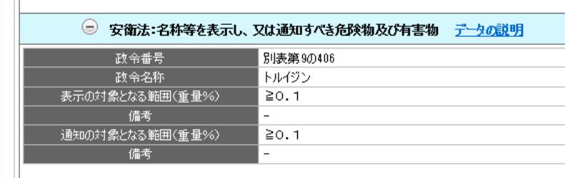 検索結果が出力されたら、画面を下方向スクロールさせる。「安衛法:名称等を表示し、又は通知すべき危険物及び有害物」の項目があって、そこに物質名が記載されていれば、通知対象物である。