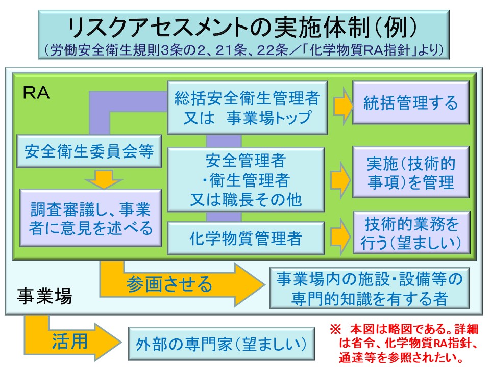 労働安全衛生規則第3条の2には、総括安全衛生管理者が統括管理する業務として、"リスクアセスメントとその結果に基づく措置"を定められている。すなわち、事業場のトップが総括管理するとともに、衛生委員会で労働者の意見を聴く必要があるということである。