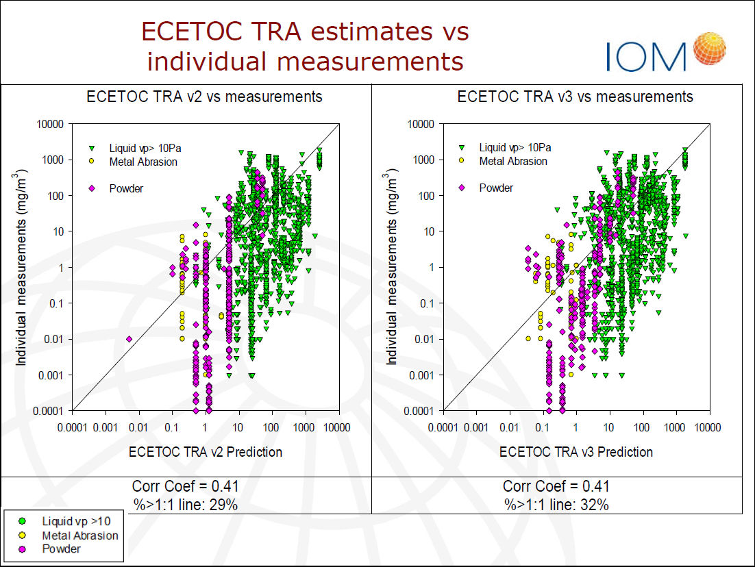 この図の横軸はTRAによる推測値で、縦軸は実際の個人ばく露の測定値で、対数目盛となっています。図の中の45度の線上にプロットがあれば、その作業者についてはTRAによる推測値と測定値が一致していることになります。この線よりも上にプロットされていれば、TRAによるリスクアセスメント結果よりも、実際のリスクが高いということを意味します。逆に、下にプロットされていれば、実際のリスクの方が低いのですが、過剰な対策が求められたということになります。