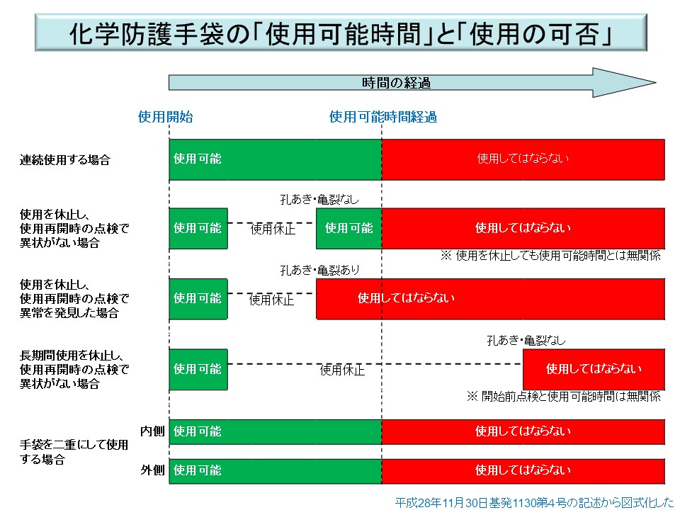 なお、同通達は「強度の向上等の目的で、化学防護手袋とその他の手袋を二重装着した場合でも、化学防護手袋は使用可能時間の範囲で使用させること」としている。二重装着したからといって、使用可能時間が倍になるわけではないのである。