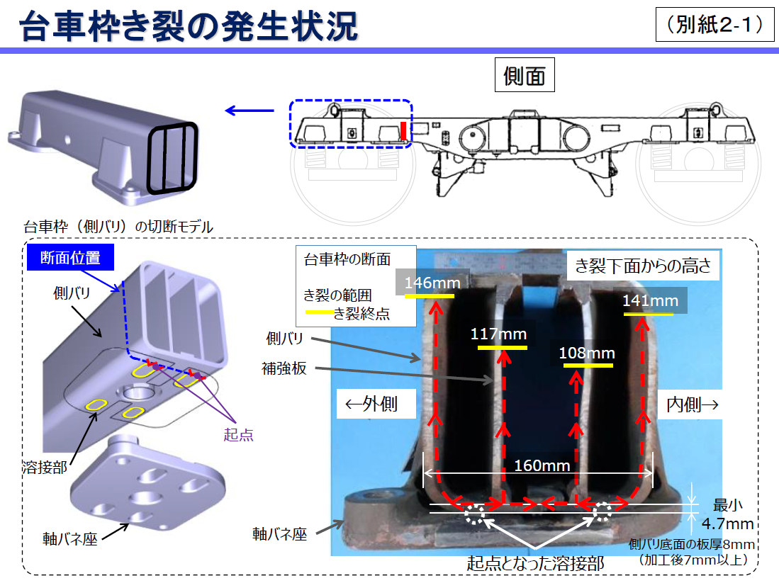 2月28日の「報告書」によると、台車枠へ亀裂が入った原因は、車両の製造時に、梁の底面を削りすぎたために設計上必要とされた厚みがなくなり、溶接部を起点として疲労破壊が起きたと考えられるとされている。具体的な記述内容は、次に引用する通りである。