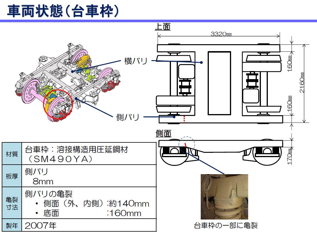 ただ、事故後のJR西日本の対応は早かった。このことも評価されてよいと思う。事件の翌12日には事件について第1報(※)を出している。その中で、13号車の台車の亀裂の図も示している。