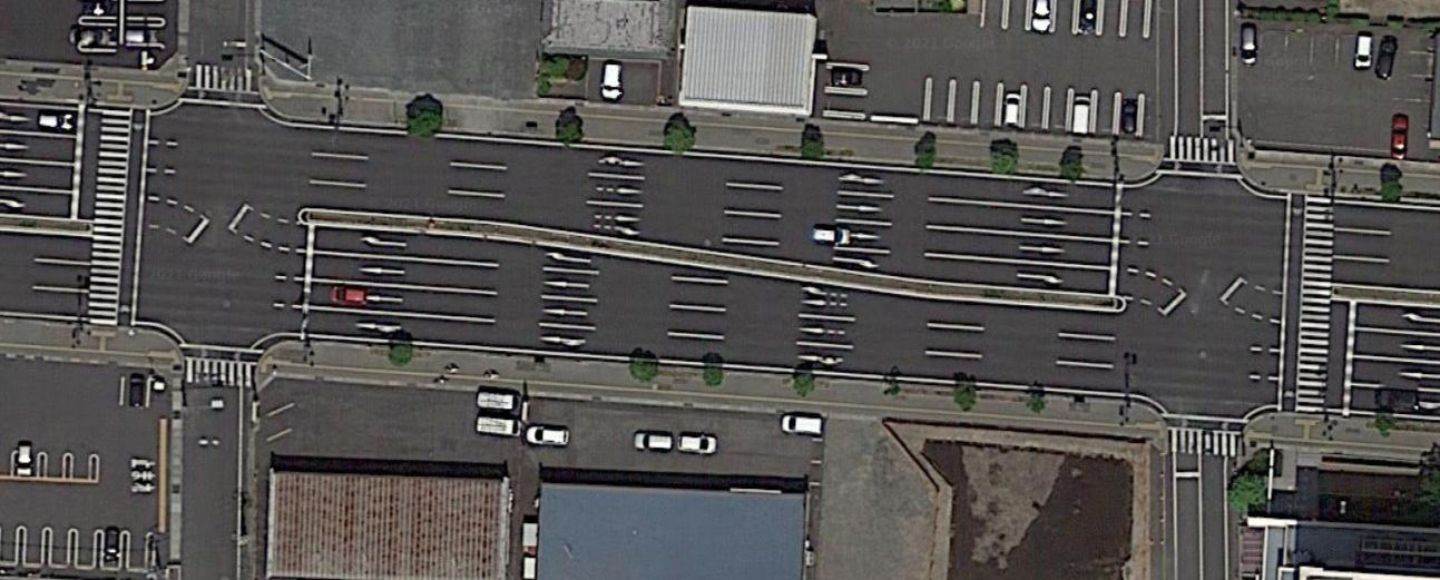 また、この道路ではそもそも大通りを渡る歩道のない交差点もかなりあるのである。このような交差点では、歩行者は大通りをかなり歩いて歩道のある交差点まで行って渡らなければならない。